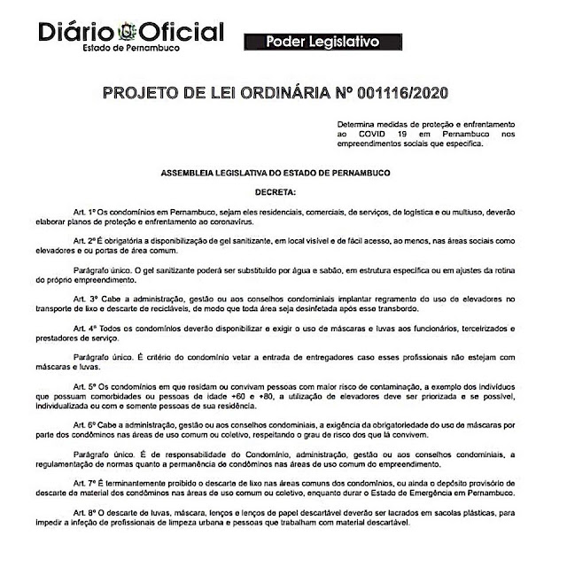 A medida determina que nos protocolos de segurança de cada condomínio constem medidas como: a disponibilização de gel sanitizante ou pias com água e sabão em locais de fácil acesso; regulamentação de normas quanto a permanência de condôminos nas áreas de uso comum; o uso prioritário do elevador caso tenham pessoas idosas ou com comorbidades. Além disso o projeto de lei determina que esses empreendimentos disponibilizem máscaras e luvas e exijam seu uso para funcionários, terceirizados e prestadores de serviço. A proposição ainda prevê que o descarte de luvas e máscaras deverá ser feito separadamente e identificado como material contaminante e que a administração do prédio poderá vetar a entrada de entregadores sem máscara ou luvas.